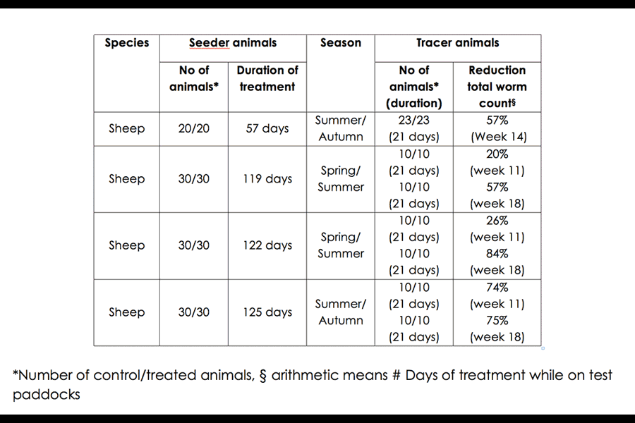 Natural infections consisted predominantly of Haemonchus spp., Trichostrongylus spp. and Teladorsagia spp., including multi-resistant strains. The results demonstrated the ability of the Test Product to reduce the infectivity of pasture by 57-82%, as expressed in worm numbers infecting tracer sheep after grazing trial pastures. The results were consistent in sheep across a range of climatic zones and during different seasons.